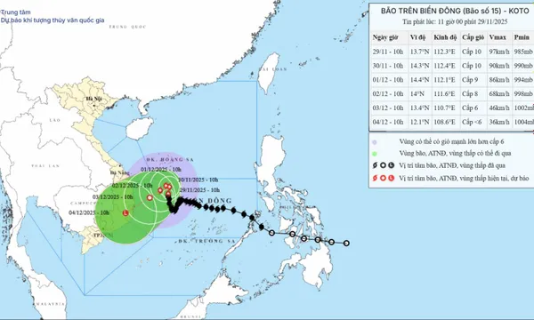 Dự báo đến 10 giờ ngày 30/11, bão trên vùng biển phía Tây Bắc khu vực giữa Biển Đông, cách bờ biển phía Đông tỉnh Gia Lai - Đắk Lắk khoảng 340 km về phía Đông. Bão di chuyển theo hướng Bắc với tốc độ khoảng 3 km/h. Sức gió mạnh nhất cấp 9 - 10, giật cấp 13.