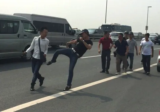 Phóng viên Quang Thắng (áo trắng) bị hành hung khi đang tác nghiệp trên cầu Nhật Tân.
