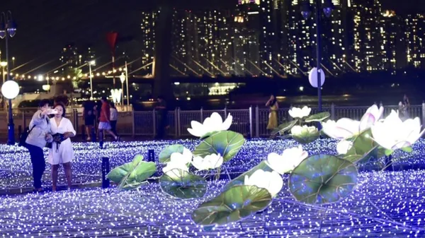 Kỷ niệm 50 năm quan hệ ngoại giao Việt Nam - Nhật Bản, ban tổ chức lắp đặt 500.000 đèn LED tạo nên 'hồ sen', 'khu vườn Sakura' ánh sáng, cảnh tượng rực sáng công viên bến Bạch Đằng - tạo sắc màu sinh động, ấm áp cho biểu tượng quan hệ gắn bó giữa Việt Nam - Nhật Bản.