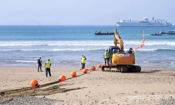Một đội xây dựng cáp quang biển của Google đang thi công hệ thống cáp ở bờ biển nước Anh - Ảnh: Google