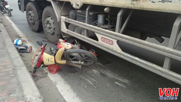 Cú va chạm khiến 2 vợ chồng cùng chiếc xe máy bị kẹt dưới gầm trước đầu xe tải.