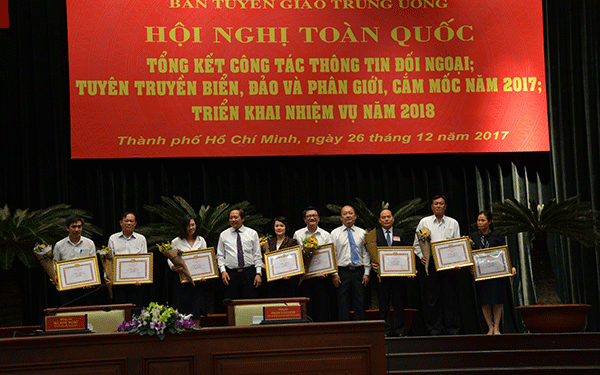 Dịp này, Ban Tuyên giáo Trung ương trao tặng bằng khen cho 20 tập thể và 14 cá nhân đạt thành tích xuất sắc trong công tác thông tin đối ngoại, tuyên truyền biển, đảo, phân giới, cắm mốc và quản lý biên giới trên đất liền năm 2017.