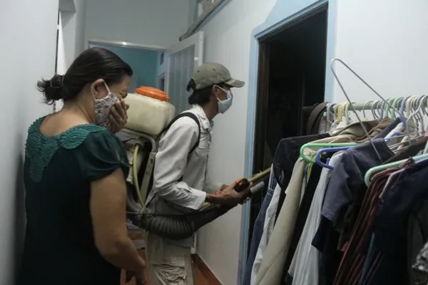 Trung tâm Y tế dự phòng Q.2 phun thuốc diệt muỗi tại P.Thạnh Mỹ Lợi, Q.2, TPHCM chiều 5/4 - Ảnh: TTO.