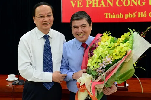 Trưởng Ban Tổ chức trung ương Tô Huy Rứa (trái) chúc mừng ông Nguyễn Thành Phong nhận nhiệm vụ phó bí thư Thành ủy TP.HCM (Tháng 3/2015) - Ảnh: TTO.