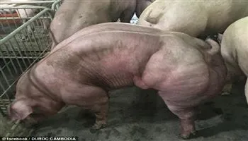 Những con heo dường như không thể đi lại bình thường do các bắp thịt quá toTheo Daily Mail, Công ty Duroc Campuchia dường như đã biến đổi gen loài vật này.