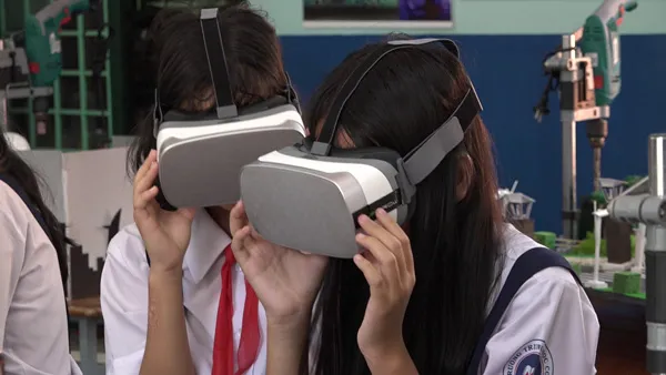 Trong giờ Vật Lý về mạch điện, các em được học với trợ giảng hiệu quả là kính thực tế ảo. Tình huống được đưa ra là làm cách nào thoát khỏi đám cháy chỉ là phần mở đầu để giáo viên hướng dẫn học sinh biết được nguyên lý hoạt động của mạch điện, khả năng chập mạch.