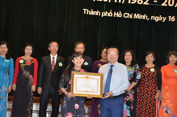 Ông Lê Hồng Sơn, giám đốc sở GD & ĐT TPHCM trao bằng khen của Thủ tướng Chính phủ cho các Nhà giáo.