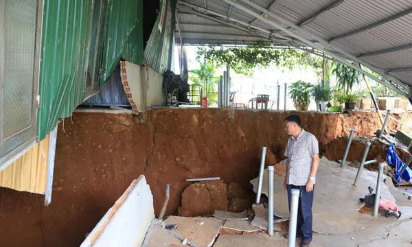 Tại khu vực này, quán cà phê và căn nhà của ông Ngô Văn Vinh, trú tại xã Quảng Tín, huyện Đắk R’lấp, đã bị ảnh hưởng nặng nề. Khối sạt trượt lớn khiến căn nhà của ông Vinh bị xiêu vẹo và biến dạng nghiêm trọng.