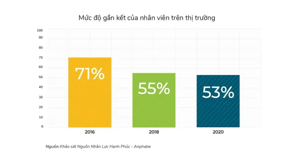 Nhưng ở một mặt khác, không ít người đi làm đang mơ về “ngọn đồi xanh” khác. Kết quả khảo sát Nguồn nhân lực Hạnh phúc qua các năm cho thấy người đi làm tại Việt Nam càng ngày càng giảm gắn kết với công ty và đà giảm gắn kết này diễn ra liên tục trong vòng năm năm qua, từ 71% năm 2016 xuống còn 53% năm 2020.