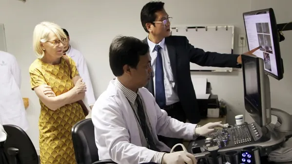Ông Nguyễn Đình Quang Chủ tịch Viện Gút hướng dẫn GS Christine Chủ tịch ĐH Paris 7 thăm Viện Gút