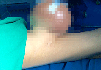 Ông bị khối u đeo bám bên đùi phải suốt thời gian dài. 3 tháng gần đây, khối u phát triển lớn hơn và bị loét rộng trên u gây hiện tượng chảy máu và đau nhức.