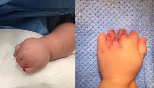 Hình bàn tay trái của bé trước và sau phẫu thuật tách ngón