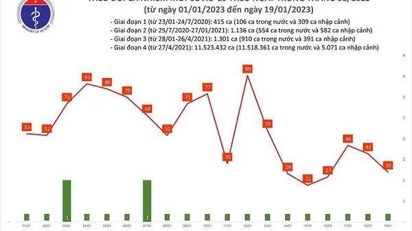 Trong ngày 18/01 có 19.660 liều vaccine phòng COVID-19 được tiêm. Như vậy, tổng số liều vaccine đã được tiêm là 266.023.532 liều, trong đó số liều tiêm cho người từ 18 tuổi trở lên là 223.662.564 liều: Mũi 1 là 71.082.048 liều; Mũi 2 là 68.700.098 liều; Mũi bổ sung là 14.534.326 liều; Mũi nhắc lại lần 1 là 51.864.234 liều; Mũi nhắc lại lần 2 là 17.481.858 liều.
