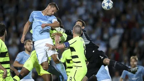 Cầu thủ Malmo bật cao dứt điểm bằng đầu trong cuộc so tài với Celtic.