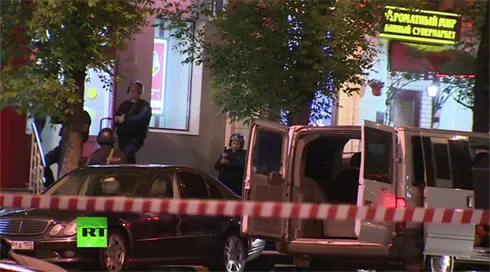 Cảnh sát có mặt tại hiện trường vụ cướp ngân hàng và bắt cóc con tin tại Moscow ngày 18/5 (Ảnh minh họa: RT)