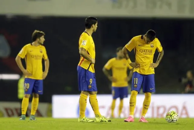 Suarez, Neymar và các đồng đội thất vọng sau khi nhận trận thua đầu tiên ở mùa giải năm nay. Ảnh: Reuters