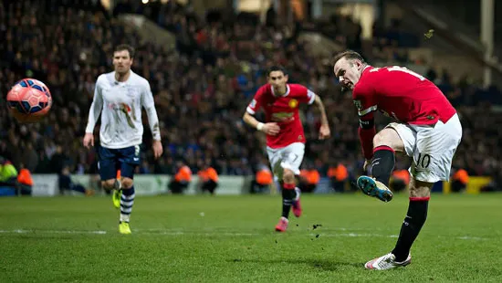 Tiền đạo Wayne Rooney đánh bại thủ thành Thorsten Stuckmann của Preston North End.