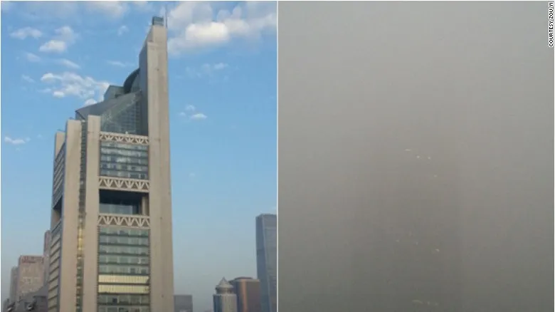 Khung cảnh nhìn từ nhà ông Zou Yi ở Bắc Kinh vào ngày 27/9/2015 (bên trái), và cảnh tương tự ghi lại vào ngày 01/12/2015 (Ảnh:CNN)