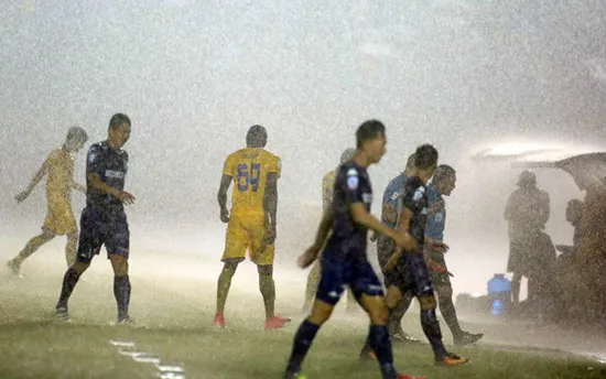 Trận chung kết lượt đi tại Gò Đậu bị tạm hoãn gần 30 phút vì mưa lớn. Ảnh: Nguyên Khôi