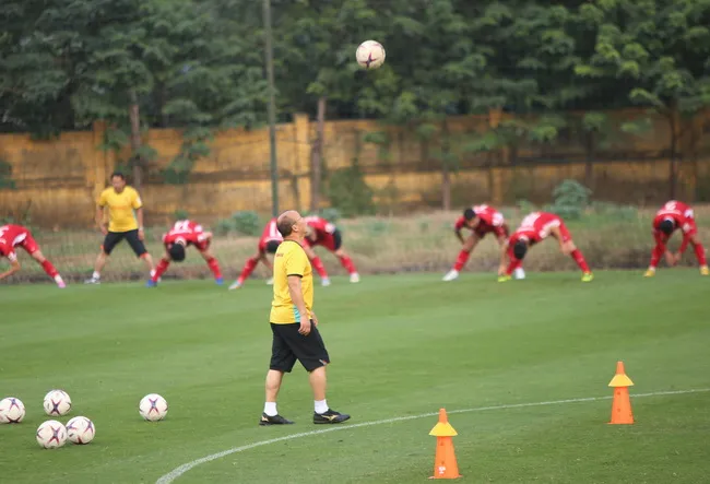 Thầy Park tâng bóng như một cách để giải tỏa bớt áp lực trong buổi tập chuẩn bị cho trận gặp Malaysia. Ảnh: Như Đạt.