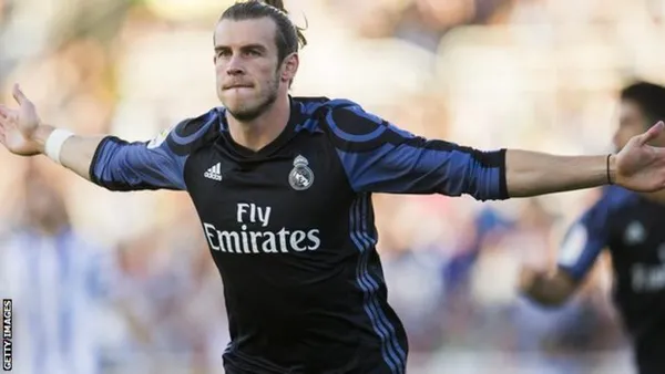 Bale ăn mừng bàn thắng ghi vào lưới Real Sociedad.