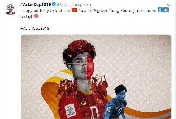 Trong ngày sinh nhật (21/1) của Công Phượng, Liên đoàn bóng đá châu Á (AFC) cũng đã đăng tải lời chúc mừng sinh nhật đến số 10 của tuyển Việt Nam thông qua trang facebook và Twitter.