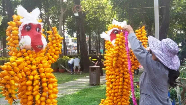 Trái dư, một loại trái chưng Tết của miền Tây được xếp mô hình khỉ, rồng khá lạ mắt có giá lên tới 15 triệu/cặp nhưng khách chủ yếu xem và hỏi giá vì tò mò chứ không mặn mà, một thương lái cho biết.