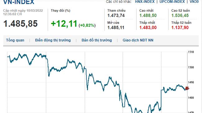Dừng phiên sáng 10/3, VN-Index tăng 12,11 điểm (0,82%) lên 1.485,85 điểm, HNX-Index tăng 4,01 điểm (0,9%) lên 448,61 điểm, UPCoM-Index tăng 1,62 điểm (1,43%) đạt 114,99 điểm