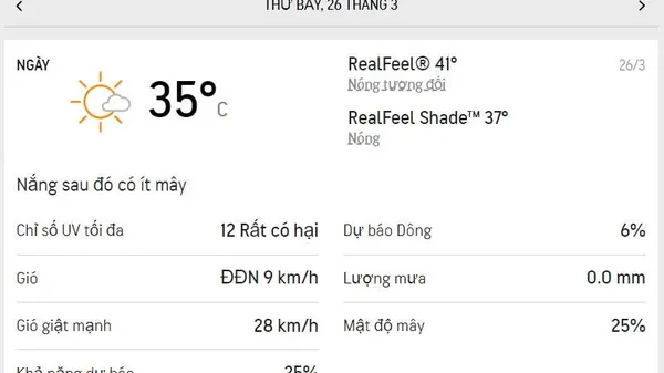 Buổi sáng Thứ Bảy 26/3, trời ít mây, nhiều nắng. Đặc biệt, giữa trưa lượng tia UV cao nhất lên đến mức 12 (Nguồn: Accuweather)