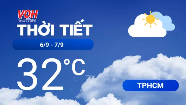 Ngày mai 7/9, TPHCM có mây, nắng nhẹ. Nhiệt độ buổi sáng trong khoảng 27-32 độ C. Độ ẩm không khí trung bình 75%. Gió cấp 1, giật trên cấp 2, hướng Tây Tây Nam, vận tốc 11-28km/h. Lượng UV cao nhất lúc giữa trưa ở mức 6.