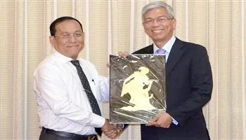 Chánh Văn phòng UBND TP Võ Văn Hoan trao quà lưu niệm của TP cho ông Ye Aung, Bộ trưởng các vấn đề Biên giới Myanmar.
