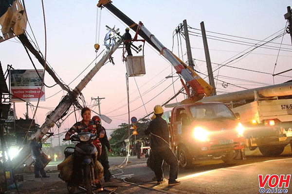 Chiều ngày 11/3, sự cố một cột điện bị kéo đổ trên đường Nguyễn Duy Trinh (phường Long Tường, quận 9, TPHCM) mới được lực lượng chức năng cơ bản khắc phục.