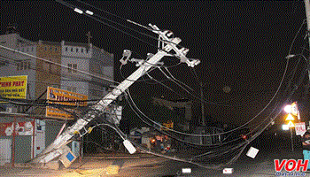 Cột điện bị kéo đổ khiến khu vực bị mất điện kéo dài.